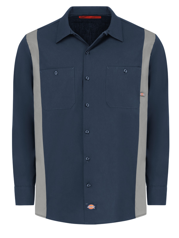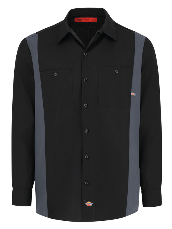 Dickies' Industrial Color Block Long Sleeve Shirt is equipped for a wide range of jobs. Constructed of easy-care, fade-resistant poplin, this shirt stays tough, yet professional, with a button closure at the neck and a two-piece lined collar with permanent stays. A square cut tail means this shirt looks good tucked in or untucked.